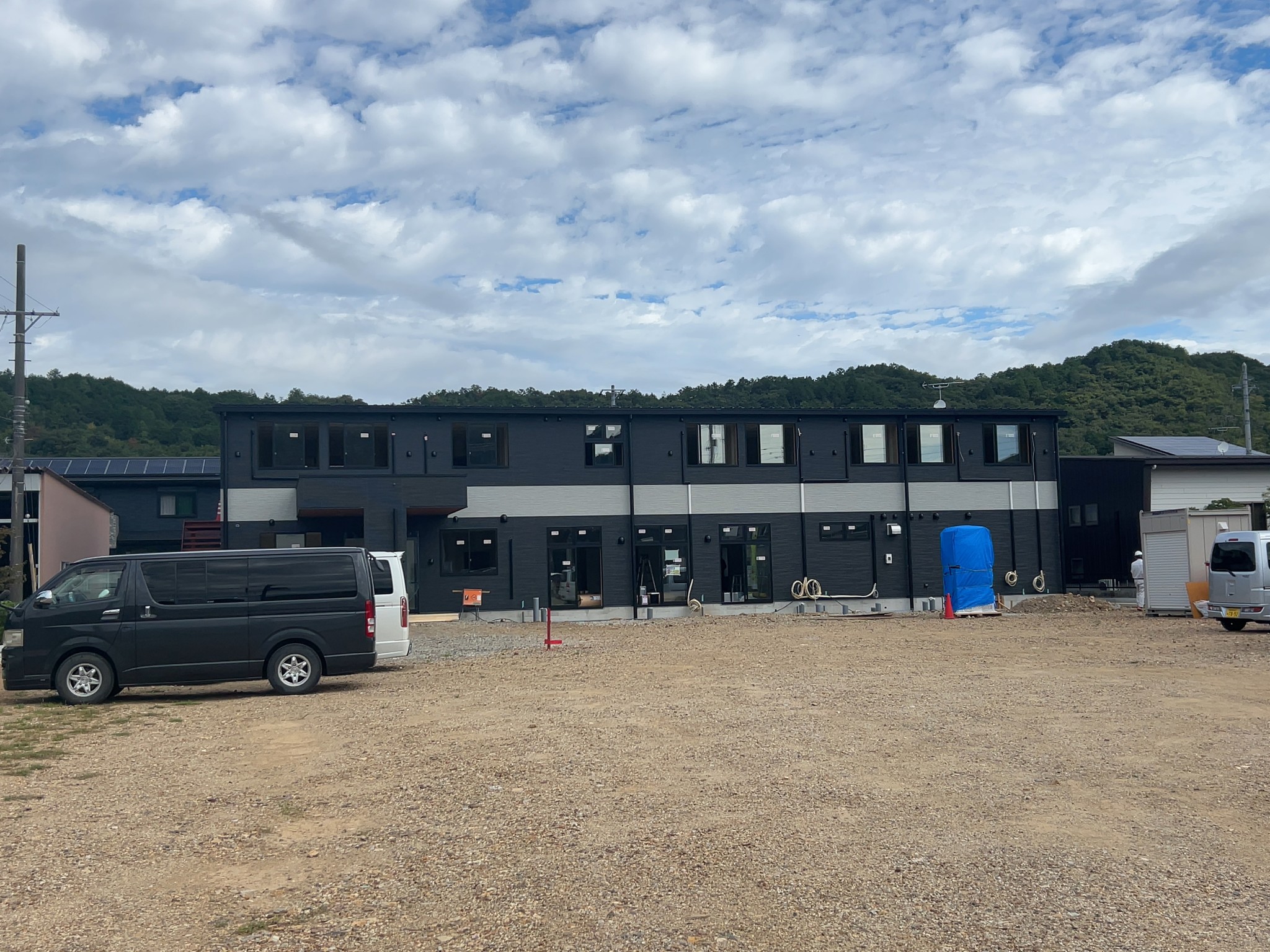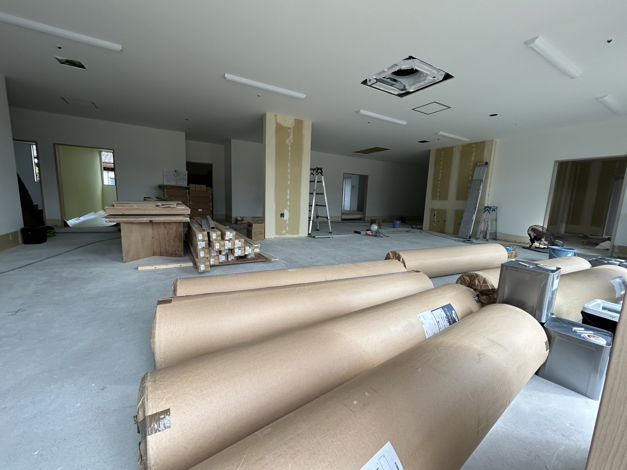 この写真は、1F 内装工事(クロス貼り・床アンダーレイ貼り)の状況です。